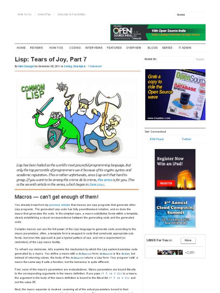 Lisp has been hailed as the worlds most powerful programming language. But only the top percentile of programmers use it because of its cryptic syntax and academic reputation. This is rather unfortunate, since Lisp isnt that hard to grasp. If you want to be among the crme de la crme, this series is for you. This is the seventh article in the series, which began in June 2011.