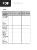 Please indicate your impressions of the items listed below. Strongly Strongly Agree Neutral Disagree Agree Disagree 1. The training met my expectations. 2. I will be able to apply the knowledge learned. 3. The training objectives for each topic were identified and followed. 4. The content was organized and easy to follow. 5. The materials distributed were pertinent and useful. 6. The trainer was knowledgeable. 7. The quality of instruction was good. 8. The trainer met the training objectives. 9. Class participation and interaction were encouraged. 10. Adequate time was provided for questions and discussion. 11. How do you rate the training overall? Excellent Good
