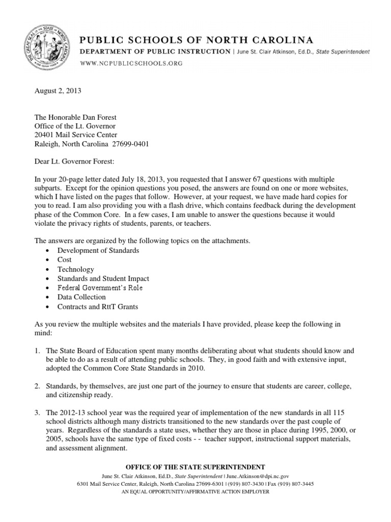 The Honorable Dan Forest Office of the Lt. Governor 20401 Mail Service Center Raleigh, North Carolina 27699-0401 Dear Lt. Governor Forest: In your 20-page letter dated July 18, 2013, you requested that I answer 67 questions with multiple subparts. Except for the opinion questions you posed, the answers are found on one or more websites, which I have listed on the pages that follow. However, at your request, we have made hard copies for you to read. I am also providing you with a flash drive, which contains feedback during the development phase of the Common Core. In a few cases, I am unable to answer the questions because it would violate the privacy rights of students, parents, or teachers. The answers are organized by the following topics on the attachments. Development of Standards Cost Technology Standards and Student Impact Federal Governments Role Data Collection Contracts and RttT Grants As you review the multiple websites and the materials I have provided, please keep the following in mind: 1. The State Board of Education spent many months deliberating about what students should know and be able to do as a result of attending public schools. They, in good faith and with extensive input, adopted the Common Core State Standards in 2010. 2. Standards, by themselves, are just one part of the journey to ensure that students are career, college, and citizenship ready. 3. The 2012-13 school year was the required year of implementation of the new standards in all 115 school districts although many districts transitioned to the new standards over the past couple of years. Regardless of the standards a state uses, whether they are those in place during 1995, 2000, or 2005, schools have the same type of fixed costs - - teacher support, instructional support materials, and assessment alignment.