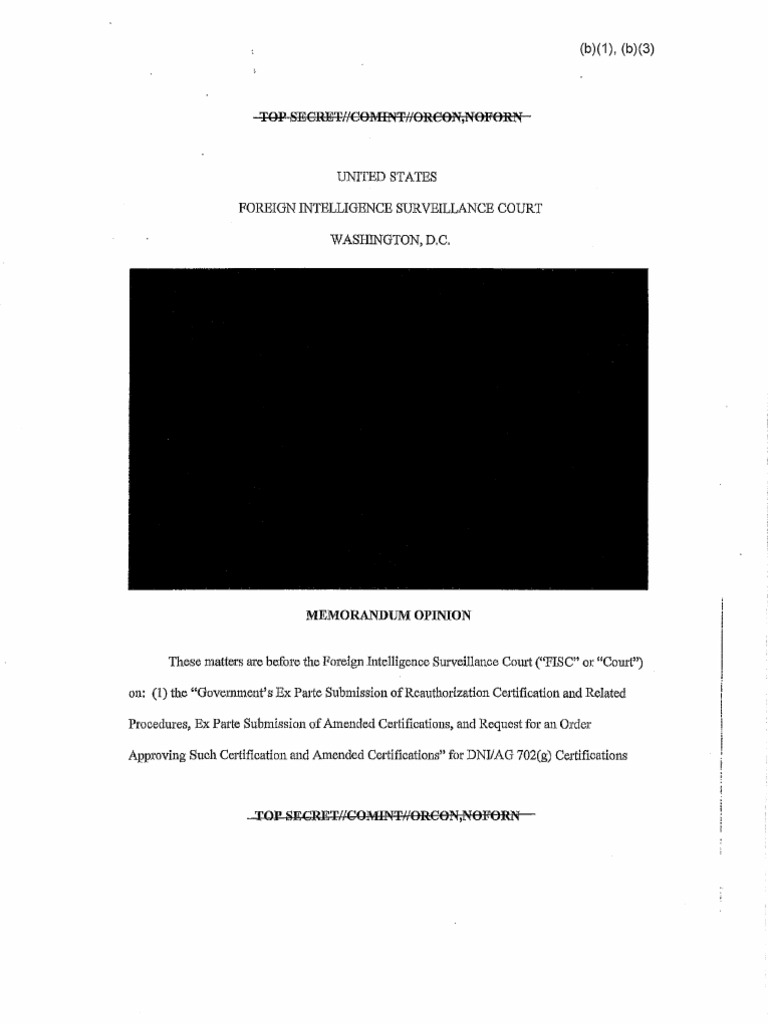 Description: FISA court ruling striking down a National Security Agency program that unlawfully gathered as many as tens of thousands of e-mails and other electronic communications between Americans before it w...