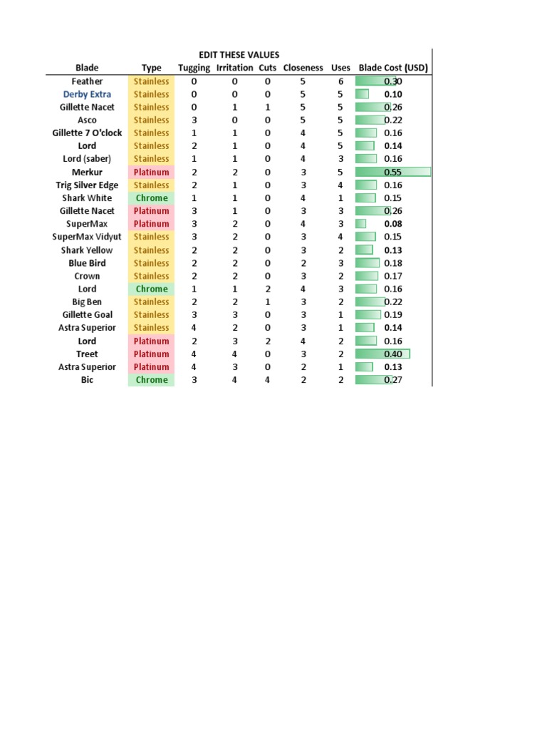 EDIT THESE VALUES Type Tugging Irritation Cuts Closeness Uses Blade Cost (USD) Stainless 0 0 0 5 6 0.30 Stainless 0 0 0 5 5 0.10 Stainless 0 1 1 5 5 0.26 Stainless 3 0 0 5 5 0.22 Stainless 1 1 0 4 5 0.16 Stainless 2 1 0 4 5 0.14 Stainless 1 1 0 4 3 0.16 Platinum 2 2 0 3 5 0.55 Stainless 2 1 0 3 4 0.16 Chrome 1 1 0 4 1 0.15 Platinum 3 1 0 3 3 0.26 Platinum 3 2 0 4 3 0.08 Stainless 3 2 0 3 4 0.15 Stainless 2 2 0 3 2 0.13 Stainless 2 2 0 2 3 0.18 Stainless 2 2 0 3 2 0.17 Chrome 1 1 2 4 3 0.16 Stainless 2 2 1 3 2 0.22 Stainless 3 3 0 3 1 0.19 Stainless 4 2 0 3 1 0.14 Platinum 2 3 2 4 2 0.16 Platinum 4 4 0 3 2 0.40 Platinum 4 3 0 2 1 0.13 Chrome 3 4 4 2 2 0.27
