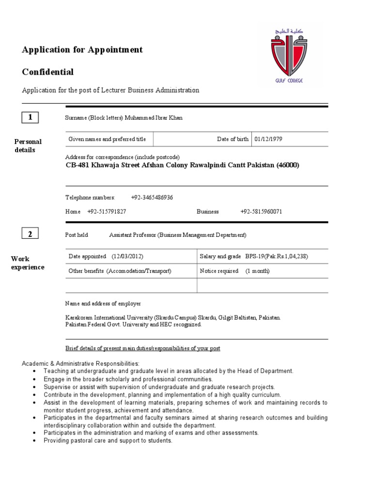 Application for the post of Lecturer Business Administration