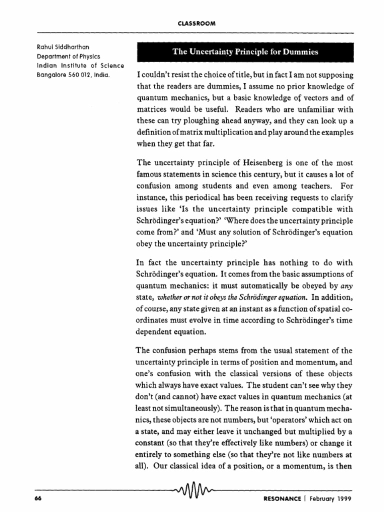 The Uncertain!y Principle for Dummies I couldn't resist the choice of title, but in fact I am not supposing that the readers are dummies, I assume no prior knowledge of quantum mechanics, but a basic knowledge of vectors and of matrices would be useful. Readers who are unfamiliar with these can try ploughing ahead anyway, and they can look up a definition of matrix multiplication and play around the examples when they get that far. The uncertainty principle of Heisenberg is one of the most famous statements in science this century, but it causes a lot of confusion among students and even among teachers. For instance, this periodical has been receiving requests to clarify issues like 'Is the uncertainty principle compatible with Schr/Sdinger's equation?' 'Where does the uncertainty principle come from?' and 'Must any solution of Schr6dinger's equation obey the uncertainty principle?' In fact the uncertainty principle has nothing to do with Schr6dinger's equation. It comes from the basic assumptions of quantum mechanics: it must automatically be obeyed by any state, whether or not it obeys the Schr6dinger equation. In addition, of course, any state given at an instant as a function of spatial coordinates must evolve in time according to Schr6dinger's time dependent equation. The confusion perhaps stems from the usual statement of the uncertainty principle in terms of position and momentum, and one's confusion with the classical versions of these objects which always have exact values. The student can't see why they don't (and cannot) have exact values in quantum mechanics (at least not simultaneously). The reason is that in quantum mechanics, these objects are not numbers, but 'operators' which act on a state, and may either leave it unchanged but multiplied by a constant (so that they're effectively like numbers) or change it entirely to something else (so that they're not like numbers at all). Our classical idea of a position, or a momentum, is then