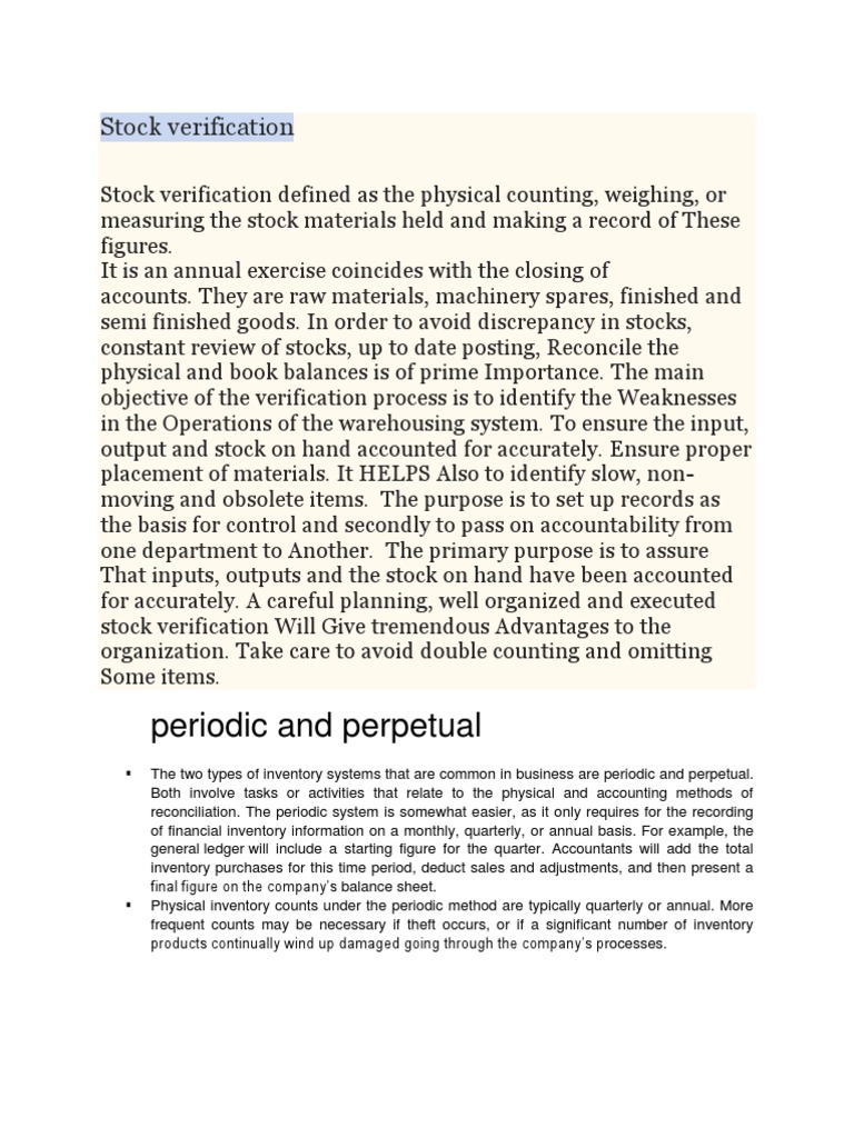 Stock verification defined as the physical counting, weighing, or measuring the stock materials held and making a record of These figures. It is an annual exercise coincides with the closing of accounts. They are raw materials, machinery spares, finished and semi finished goods. In order to avoid discrepancy in stocks, constant review of stocks, up to date posting, Reconcile the physical and book balances is of prime Importance. The main objective of the verification process is to identify the Weaknesses in the Operations of the warehousing system. To ensure the input, output and stock on hand accounted for accurately. Ensure proper placement of materials. It HELPS Also to identify slow, nonmoving and obsolete items. The purpose is to set up records as the basis for control and secondly to pass on accountability from one department to Another. The primary purpose is to assure That inputs, outputs and the stock on hand have been accounted for accurately. A careful planning, well organized and executed stock verification Will Give tremendous Advantages to the organization. Take care to avoid double counting and omitting Some items.