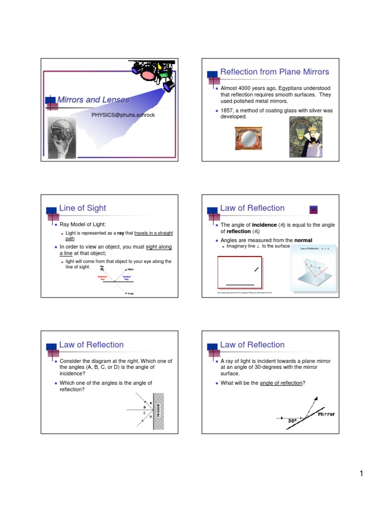 PHYSICS@phuhs.schrock Almost 4000 years ago, Egyptians understood that reflection requires smooth surfaces. They used polished metal mirrors. 1857, a method of coating glass with silver was developed.