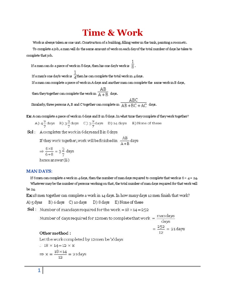 Work is always taken as one unit. Construction of a building, filling water in the tank, painting a room etc. To complete a job, a man will do the same amount of work on each day of the total number of days he takes to complete that job. If a man can do a piece of work in 8 days, then his one days work is If a mans one days work is
