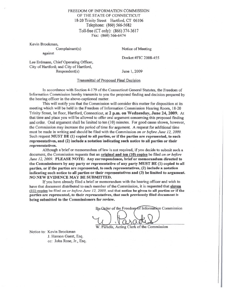 The Freedom of Information Commission hereby transmits to you the proposed finding and decision prepared by the hearing officer in the above-captioned matter. At that time and place you will…