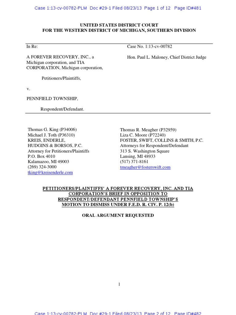 In Re: A FOREVER RECOVERY, INC., a Michigan corporation, and TIA CORPORATION, Michigan corporation, Petitioners/Plaintiffs, Case No. 1:13-cv-00782 Hon. Paul L. Maloney, Chief District Judge v. PENNFIELD TOWNSHIP, Respondent/Defendant. Thomas G. King (P34006) Michael J. Toth (P36310) KREIS, ENDERLE, HUDGINS & BORSOS, P.C. Attorney for Petitioners/Plaintiffs P.O. Box 4010 Kalamazoo, MI 49003 (269) 324-3000 tking@kreisenderle.com Thomas R. Meagher (P32959) Liza C. Moore (P72240) FOSTER, SWIFT, COLLINS & SMITH, P.C. Attorneys for Respondent/Defendant 313 S. Washington Square Lansing, MI 48933 (517) 371-8161 tmeagher@fosterswift.com