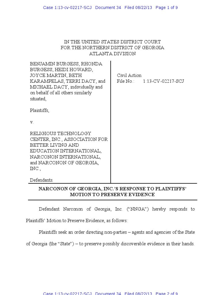 Defendant Narconon of Georgia, Inc. (“NNGA”) hereby responds toPlaintiffs’ Motion to Preserve Evidence, as follows:Plaintiffs seek an order directing non-parties – agents and agencies of the Stateof Georgia (the “State”) – to preserve possibly discoverable evidence in their hands.
