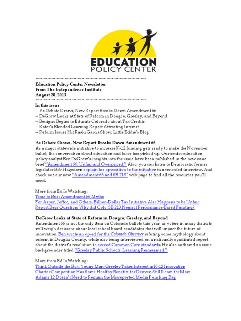 -- As Debate Grows, New Report Breaks Down Amendment 66 -- DeGrow Looks at State of Reform in Dougco, Greeley, and Beyond -- Benigno Begins to Educate Colorado about Tax Credits -- Kafers Blended Learning Report Attracting Interest -- Reform Issues Hit Raaki Garcia Show, Little Eddies Blog As Debate Grows, New Report Breaks Down Amendment 66 As a major statewide initiative to increase K-12 funding gets ready to make the November ballot, the conversation about education and taxes has picked up. Our senior education policy analyst Ben DeGrows insights into the issue have been published in the new issue brief Amendment 66: Unfair and Overpriced. Also, you can listen to Democratic former legislator Bob Hagedorn explain his opposition to the initiative in a recorded interview. And check out our new Amendment 66 and SB 213 web page to find all the resources youll need. More from Ed Is Watching: Time to Bust Amendment 66 Myths For Aspen, Jeffco, and Others, Billion-Dollar Tax Initiative Also Happens to be Unfair Report Begs Question: Why did Colo. SB 213 Neglect Performance-Based Funding? DeGrow Looks at State of Reform in Dougco, Greeley, and Beyond Amendment 66 is not the only item on Colorado ballots this year, as voters in many districts will weigh decisions about local school board candidates that will impact the future of innovation. Ben wrote an op-ed for the Colorado Observer refuting some mythology about reform in Douglas County, while also being interviewed on a nationally syndicated report about the districts resolution to exceed Common Core standards. He also authored an issue backgrounder titled Greeley Public Schools: Learning Reimagined. More from Ed Is Watching: Think Outside the Box, Young Man: Greeley Takes Interest in K-12 Innovation Charter Competition Has Some Healthy Benefits for Denver, Still Room for More Adams 12 Doesnt Need to Remain the Misreported Media Punching Bag