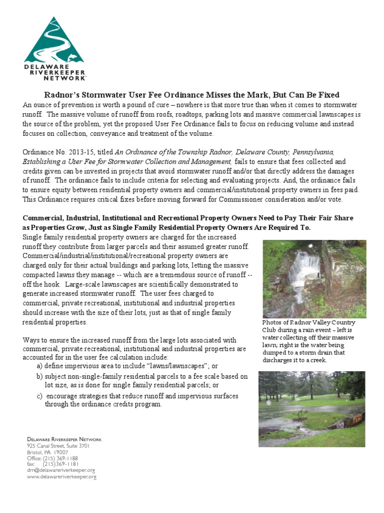The Draft Ordinance Needs to Include Reference to Pennsylvanias Stormwater Manual. The draft ordinance fails to reference the Pennsylvania Stormwater BMP Manual. The purpose of the Pennsylvania Stormwater Best Management Practices (BMP) Manual is to provide guidance, options and tools that can be used to protect water quality, enhance water availability and reduce flooding potential through effective stormwater management, and to provide guidance to help meet state and federal requirements regarding stormwater. Failure to reference this state guidance and benefit from its guidance in how User Fees might be best invested to meet Township needs and legal obligations is an oversight that should be remedied. The Draft Ordinance Needs to Focus on Stormwater Strategies that Avoid, Minimize and/or Infiltrate Stormwater, Not Just Control It Once It Happens. It is important that the ordinance be properly focused on avoidance of runoff rather than just controlling runoff. 1. The Statement of Findings language is about control of stormwater runoff; it should be edited to focus on strategies that avoid and minimize runoff. 2. As drafted, user fees collected are to be used on collecting, conveying, detaining and/or treating stormwater; instead, the ordinance should focus their use on systems that avoid, minimize and/or infiltrate stormwater. Applicable federal and state laws and policies emphasize the priority importance of stormwater avoidance, minimization and infiltration (i.e. soaking stormwater into the soil). As such, it is critical that Radnor include emphasis on these strategies e.g., avoiding and/or reducing runoff volume and improving infiltration -- in the implementation and use of its User Fee program. 3. The credit program as written is focused on water treatment (i.e. water quality), rather than reduction of runoff volume or harms. Credits should be given for measures that avoid and/or infiltrate runoff, which are the best approaches for avoiding water pollution, as well as avoiding flood damages, including harms to homes, erosion, and flooding roadways. Credits should also be given for protecting natural flows and addressing existing stormwater damages such as erosion. The limitation of credits for onsite treatment of stormwater runoff is a gross oversight and should be remedied. Fee Forgiveness for Residents in Hardship Situations and for Township-Owned Properties and School District Properties Should Be Considered and Not Forbidden, As They Are Now. There needs to be fee forgiveness for those residents for whom this fee is a genuine hardship. Fee forgiveness should also be allowed for township-owned recreational facilities and school properties that are owned and operated for the benefit of all township residents and for whom any user fee could ultimately be passed along to residents in the form of increased taxes or other charges. The Ordinance Should Consider Ensuring Shared Direct Benefit From the Fees Generated. Just as the ordinance collects fees from all Radnor communities, there should be consideration for ensuring use of fees on projects in each of the Townships watersheds and communities. Criteria for Project Selection and Measurements of Success are Needed. There needs to be added to the ordinance either specific criteria for selecting projects and measuring the success of projects funded and implemented or a directive that there be created a committee that will set such project selection criteria and mechanism for identifying and reporting on the results of projects undertaken. The proposed stormwater user fee ordinance as drafted fails to ensure that the program is equitably implemented and that funds generated will be used to best effect for the community. The Township Commissioners are seeking comments. Write them at: 301 Iven Avenue Wayne, PA 19087; or email your comments to the Board President at eschaefer@[Link]. To see the full Delaware Riverkeeper Network comment: [Link]
