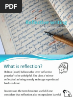 Overview Reflective writing is a series of 'writings' in response to life experiences & events that may also contains reflections on what took place, express emotions, understandings & conclusions, lessons learned or action plans. Often called a Journal Entry You don't have to be a great writer, perfect speller, or creative thinker to keep a personal journal. Just regularly write down your experiences and thoughts. Why do we write Reflective Journals? Lots of people keep journals as part of their hobbies! How many of the following journals have you kept? Bird watching, Train spotting, Gardening, Diet or training, Idea files, Trip diary, Dream journal, Book journal, Wine journal, Blogs When we refer to reflective journals we are exploring our learning. Is there a Structure to a Reflective Journal Entry? A reflective journal entry is a conversation with yourself (and possibly your faculty) and follows the four components of the Focused Conversation Method. Often you hear the method called by its acronym ORID. Objective Data Describe a situation: what did you see, hear, taste, smell, and touch? Reflective Data Describe your reaction; often an emotion or a feeling. This is what tells you the situation is important and worth writing about. Interpretive Data Try to explain what you have observed. Use some concept from the course here! Decisional Data Make a plan about what you will do differently (or the same) the next time you are in a similar situation or what you need to learn to do differently to manage the situation better the next time! This part of your journal entry should be stated in terms of a SMART Goal. For more information about SMART Goals, see pages 73 and 74 in Team Launch! In this reference, the terms goal and objective are used interchangeably. Specific Measurable Agreed upon Realistic Time framed