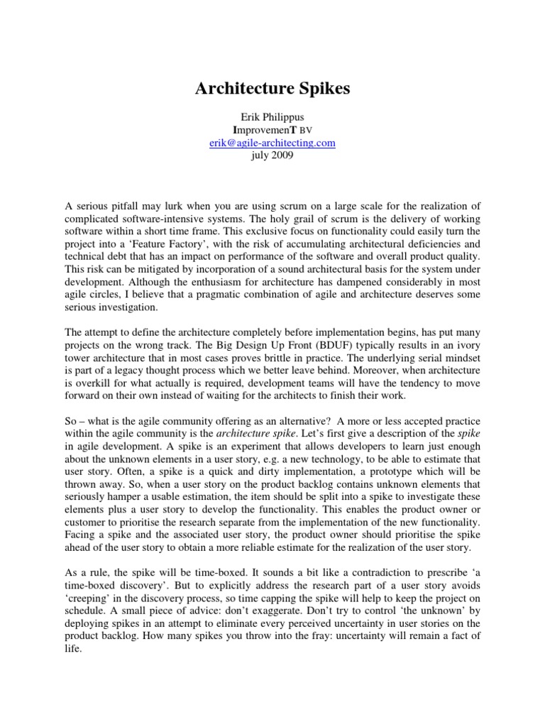 A serious pitfall may lurk when you are using scrum on a large scale for the realization of complicated software-intensive systems. The holy grail of scrum is the delivery of working software within a short time frame. This exclusive focus on functionality could easily turn the project into a Feature Factory, with the risk of accumulating architectural deficiencies and technical debt that has an impact on performance of the software and overall product quality. This risk can be mitigated by incorporation of a sound architectural basis for the system under development. Although the enthusiasm for architecture has dampened considerably in most agile circles, I believe that a pragmatic combination of agile and architecture deserves some serious investigation. The attempt to define the architecture completely before implementation begins, has put many projects on the wrong track. The Big Design Up Front (BDUF) typically results in an ivory tower architecture that in most cases proves brittle in practice. The underlying serial mindset is part of a legacy thought process which we better leave behind. Moreover, when architecture is overkill for what actually is required, development teams will have the tendency to move forward on their own instead of waiting for the architects to finish their work. So what is the agile community offering as an alternative? A more or less accepted practice within the agile community is the architecture spike. Lets first give a description of the spike in agile development. A spike is an experiment that allows developers to learn just enough about the unknown elements in a user story, e.g. a new technology, to be able to estimate that user story. Often, a spike is a quick and dirty implementation, a prototype which will be thrown away. So, when a user story on the product backlog contains unknown elements that seriously hamper a usable estimation, the item should be split into a spike to investigate these elements plus a user story to develop the functionality. This enables the product owner or customer to prioritise the research separate from the implementation of the new functionality. Facing a spike and the associated user story, the product owner should prioritise the spike ahead of the user story to obtain a more reliable estimate for the realization of the user story. As a rule, the spike will be time-boxed. It sounds a bit like a contradiction to prescribe a time-boxed discovery. But to explicitly address the research part of a user story avoids creeping in the discovery process, so time capping the spike will help to keep the project on schedule. A small piece of advice: dont exaggerate. Dont try to control the unknown by deploying spikes in an attempt to eliminate every perceived uncertainty in user stories on the product backlog. How many spikes you throw into the fray: uncertainty will remain a fact of life.