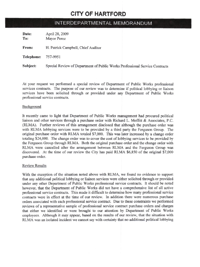 Review was to determine if political lobbying or liaison services have been solicited through or provided under any Department of Public Works professional service contracts. Department of Public Works management had procured political liaison and other services through a purchase order with RLMA.