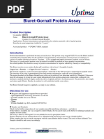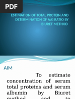 Samples with values above 15.0 g/dl should be diluted 1:1 with 0.9% saline, re-run and result multiplied by two. The Biuret procedure is not sensitive at low ranges (<1 g/dl). Do not use for urine or spinal fluid.