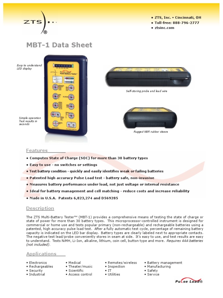 Computes State of Charge (SOC) for more than 30 battery types Easy to use - no switches or settings Test battery condition - quickly and easily identifies weak or failing batteries Patented high accuracy Pulse Load test - battery safe, non-invasive Measures battery performance under load, not just voltage or internal resistance Ideal for battery management and cell matching - reduce costs and increase reliability Made in U.S.A. Patents 6,823,274 and D569285