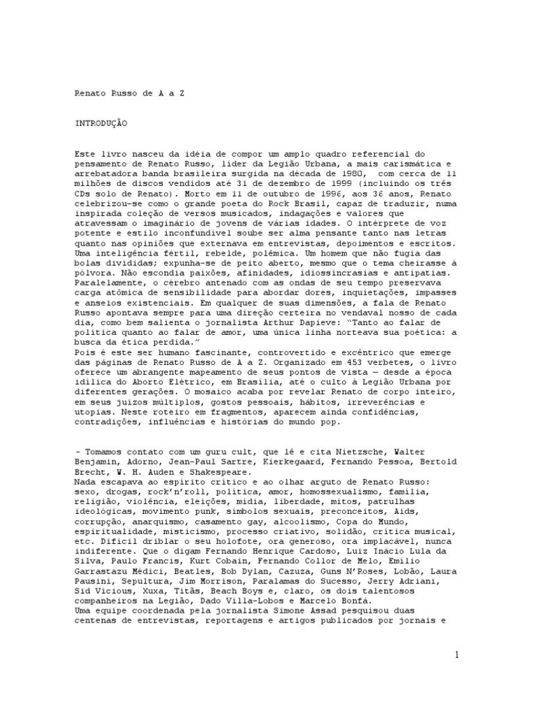 da Legio Urbana, a mais carismtica e arrebatadora banda brasileira surgida na dcada de 1980, com cerca de 11 milhes de discos vendidos at 31 de dezembro de 1999 (incluindo os trs CDs solo de Renato). Morto em 11 de outubro de 1996, aos 36 anos, Renato celebrizou-se como o grande poeta do Rock Brasil, capaz de traduzir, numa inspirada coleo de versos musicados, indagaes e valores que atravessam o imaginrio de jovens de vrias idades. O intrprete de voz potente e estilo inconfundvel soube ser alma pensante tanto nas letras quanto nas opinies que externava em entrevistas, depoimentos e escritos. Uma inteligncia frtil, rebelde, polmica. Um homem que no fugia das bolas divididas; expunha-se de peito aberto, mesmo que o tema cheirasse plvora. No escondia paixes, afinidades, idiossincrasias e antipatias. Paralelamente, o crebro antenado com as ondas de seu tempo preservava carga atmica de sensibilidade para abordar dores, inquietaes, impasses e anseios existenciais. Em qualquer de suas dimenses, a fala de Renato Russo apontava sempre para uma direo certeira no vendaval nosso de cada dia, como bem salienta o jornalista Arthur Dapieve: Tanto ao falar de poltica quanto ao falar de amor, uma nica linha norteava sua potica: a busca da tica perdida. Pois este ser humano fascinante, controvertido e excntrico que emerge das pginas de Renato Russo de A a Z. Organizado em 453 verbetes, o livro oferece um abrangente mapeamento de seus pontos de vista desde a poca idlica do Aborto Eltrico, em Braslia, at o culto Legio Urbana por diferentes geraes. O mosaico acaba por revelar Renato de corpo inteiro, em seus juzos mltiplos, gostos pessoais, hbitos, irreverncias e utopias. Neste roteiro em fragmentos, aparecem ainda confidncias, contradies, influncias e histrias do mundo pop. - Tomamos contato com um guru cult, que l e cita Nietzsche, Walter Benjamin, Adorno, Jean-Paul Sartre, Kierkegaard, Fernando Pessoa, Bertold Brecht, W. H. Auden e Shakespeare. Nada escapava ao esprito crtico e ao olhar arguto de Renato Russo: sexo, drogas, rocknroll, poltica, amor, homossexualismo, famlia, religio, violncia, eleies, mdia, liberdade, mitos, patrulhas ideolgicas, movimento punk, smbolos sexuais, preconceitos, Aids, corrupo, anarquismo, casamento gay, alcoolismo, Copa do Mundo, espiritualidade, misticismo, processo criativo, solido, crtica musical, etc. Difcil driblar o seu holofote, ora generoso, ora implacvel, nunca indiferente. Que o digam Fernando Henrique Cardoso, Luiz Incio Lula da Silva, Paulo Francis, Kurt Cobain, Fernando Collor de Melo, Emlio Garrastazu Mdici, Beatles, Bob Dylan, Cazuza, Guns NRoses, Lobo, Laura Pausini, Sepultura, Jim Morrison, Paralamas do Sucesso, Jerry Adriani, Sid Vicious, Xuxa, Tits, Beach Boys e, claro, os dois talentosos companheiros na Legio, Dado Villa-Lobos e Marcelo Bonf. Uma equipe coordenada pela jornalista Simone Assad pesquisou duas centenas de entrevistas, reportagens e artigos publicados por jornais e
