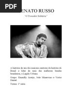 sonoro. J imaginou: E agora, com vocs, Renato Manfredini Jnior!. No d certo. Alm disso, quando a gente -: 1 1 id 1 227 Rena t RUSSO de A a Z comeou, ensaiava na colina da UnB e tinha aquela coisa de achar comunista mau. Ento, fizemos o trocadilho com t russo. E, quando eu era pequeno, inventava as minhas prprias bandas. Meu alter ego se chamava Eric Russel. Mas, abrasileirando, Erico Russo ficava estranho. Acabou Renato Russo. E forte, bom. (1994) 228 sj Rena t o Russo de A a Z SACRIFCIO Os artistas pelos quais eu tarja sacritcio para v-los, hoje em dia, acho que eu no precisaria fazer, porque seriam o Jesus & Mary Chain e The Cowboy Junkies, que nunca vo ter um pblico de estdio. Desses de ginsio, acho que o Prince e o Bowie. Eu vou a shows assim, mas, por exemplo, o Paul McCartney veio, me deu uma birra e no fui. As vezes, eu fico assim: Vai ter tanta gente l E meu dolo especial, eu quero estar s eu l, assistindo. Se eu puder ir numa boa, e se eu sentir que a galera est legal e tudo, eu vou. Mas, s vezes, fica todo mundo: Renato, Renato, autgrafo. A, eu no posso assistir. (1994) SALVAO Eu no falo porque eu queira salvar ningum; eu falo porque eu gosto. Quem sou eu para salvar algum? Eu que tenho que me salvar. (1987) SO PAULO Eu era o empresrio da banda e no sei por que cargas dgua viemos para o Rio e aqui ficamos sabendo de algumas casas noturnas em So Paulo. E eu entrei em contato com o pessoal de l lembro que ficava horas e horas falando com a Fernanda [empresria da Legio Urbana durante um tempo e atual mulher de Dado], e ela j conhecia muitas bandas. Porque, mesmo entre as pessoas que sabiam de certas bandas, havia algumas como Young Maible Giants, minha favorita que pouca gente conhecia. E pintou uma superempatia, pois a Fernanda tinha morado em Nova York. Bem, e assim armamos apresentaes em 231 7 p Rena t o Russo de A a Z So Paulo. Acho que eles gostavam, porque at hoje temos amigos l. Se fssemos uma banda ruim mesmo, no deixariam a gente tocar no circuito todo que fizemos: Woodstock, Clash, Paradise etc. Era bacana, porque tinha uma galera que sempre ia aonde a gente tocava. (1989) Eu nunca tinha percebido o lance de cidade mesmo, desemprego... Isso me espantava muito. A gente morava bem e, em So Paulo, fomos parar l no