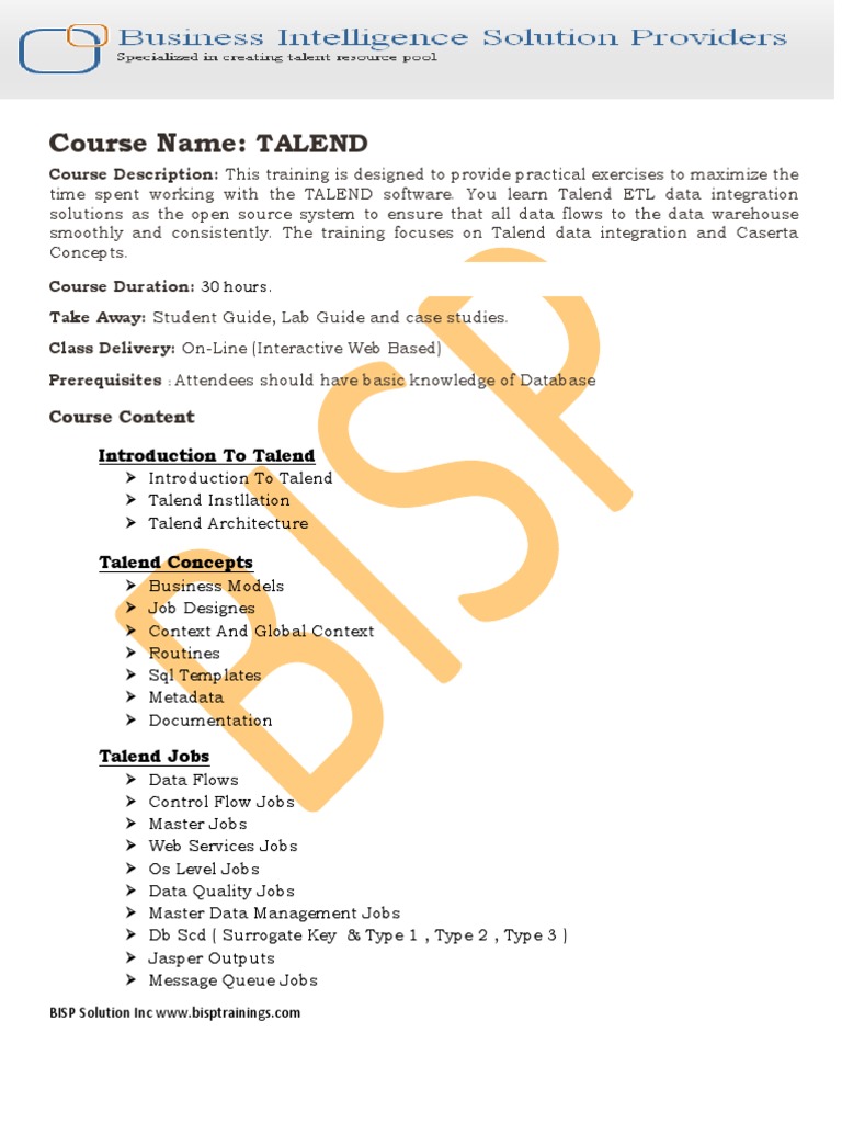Course Description: This training is designed to provide practical exercises to maximize the time spent working with the TALEND software. You learn Talend ETL data integration solutions as the open source system to ensure that all data flows to the data warehouse smoothly and consistently. The training focuses on Talend data integration and Caserta Concepts. Course Duration: 30 hours. Take Away: Student Guide, Lab Guide and case studies. Class Delivery: On-Line (Interactive Web Based) Prerequisites : Attendees should have basic knowledge of Database