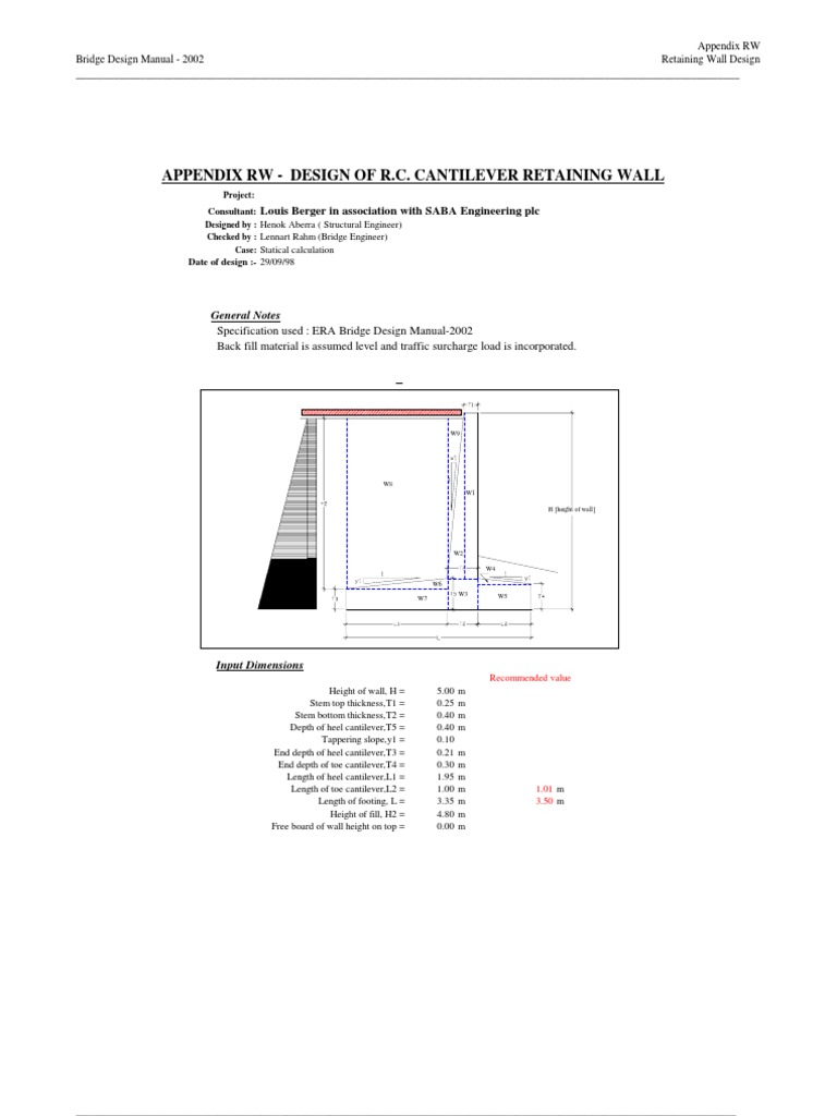 APPENDIX RW - DESIGN OF R.C. CANTILEVER RETAINING WALL