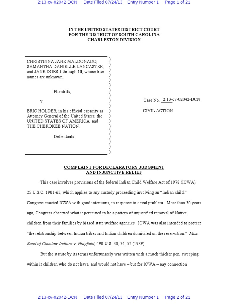 This is a civil action brought by Plaintiffs Samantha Danielle Lancaster, Christinna Maldonado and Jane Does 1 through 10 against Defendants Eric Holder, in his official capacity as an Attorney General of the United States, the United States of America, and the Cherokee Nation, for a declaration that the adoptive placement provisions of the Indian Child Welfare Act, codified at 25 U.S.C. §1915, are facially unconstitutional and unconstitutional as applied to Plaintiffs and their minor children, and for preliminary and permanent injunctive relief preventing the enforcement of those provisions.