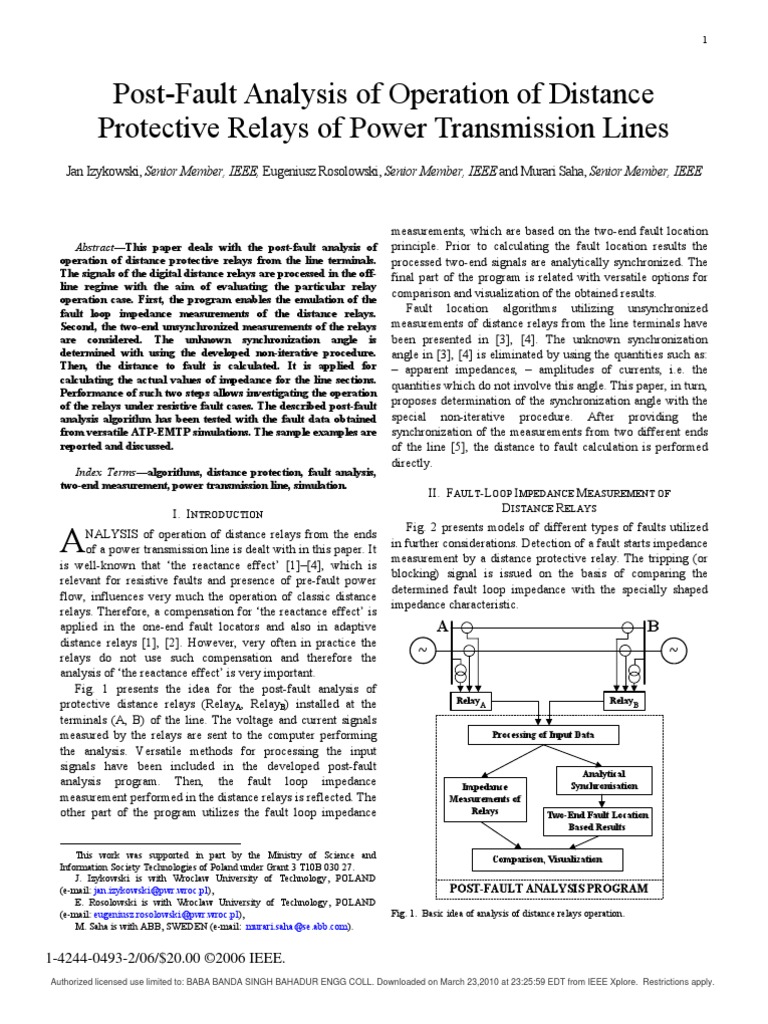 Jan Izykowski (M1997, SM04) was born in Poland in 1949. He received his [Link]., Ph.D. and [Link]. degrees from the Faculty of Electrical Engineering of Wroclaw University of Technology (WUT) in 1973, 1976 and in 2001, respectively. Presently he is an Associate Professor in the Institute of Electrical Engineering of the WUT and Director of this Institute. His research interests are in power system simulation, protection and control, and fault location. Eugeniusz Rosolowski (M97, SM00) was born in Poland in 1947. He received [Link]. degree in Electrical Eng. from the Wroclaw University of Technology (WUT) in 1972 and Ph.D. from Kiev Polytechnic Institute in 1978. In 1993 he received [Link]. from the WUT. Presently he is a Professor in the Institute of Electrical Engineering of the WUT. His research interests are in power system analysis and microprocessor applications in power systems. Murari Mohan Saha (M76, SM87) was born in 1947 in Bangladesh. He received [Link].E.E. from Bangladesh University of Engineering and Technology (BUET), Dhaka in 1968 and completed [Link].E.E. in 1970. In 1972 he completed M.S.E.E. and in 1975 he was awarded with Ph.D. from the Technical University of Warsaw, Poland. He joined ASEA, Sweden, in 1975. Currently he is a Senior Research and Development Engineer at ABB Automation Technologies, Vsters, Sweden. His areas of interest are instrument transformers, power system simulation, and digital protective relays.