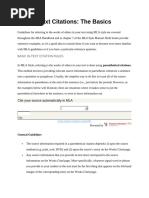 Basic In-Text Citation Rules In MLA style, referring to the works of others in your text is done by using what is known as parenthetical citation. This method involves placing relevant source information in parentheses after a quote or a paraphrase. In-Text Citations: Author-Page Style MLA format follows the author-page method of in-text citation. This means that the author's last name and the page number(s) from which the quotation or paraphrase is taken must appear in the text, and a complete reference should appear on your Works Cited page. The author's name may appear either in the sentence itself or in parentheses following the quotation or paraphrase, but the page number(s) should always appear in the parentheses, not in the text of your sentence. For example: