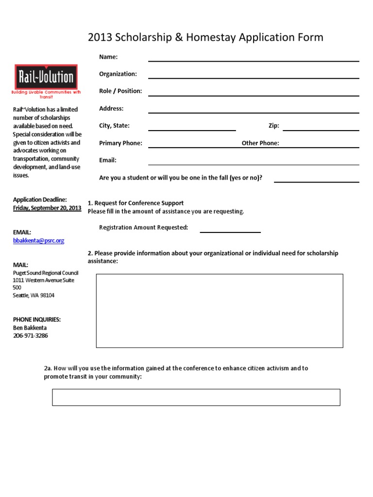 Rail~Volution has a limited number of scholarships available based on need. Special consideration will be given to citizen activists and advocates working on transportation, community development, and land-use issues.
