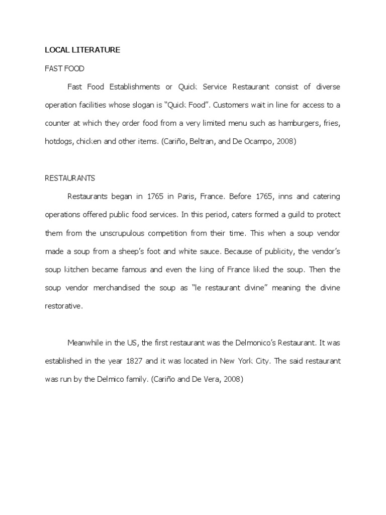 LOCAL LITERATURE FAST FOOD Fast Food Establishments or Quick Service Restaurant consist of diverse operation facilities whose