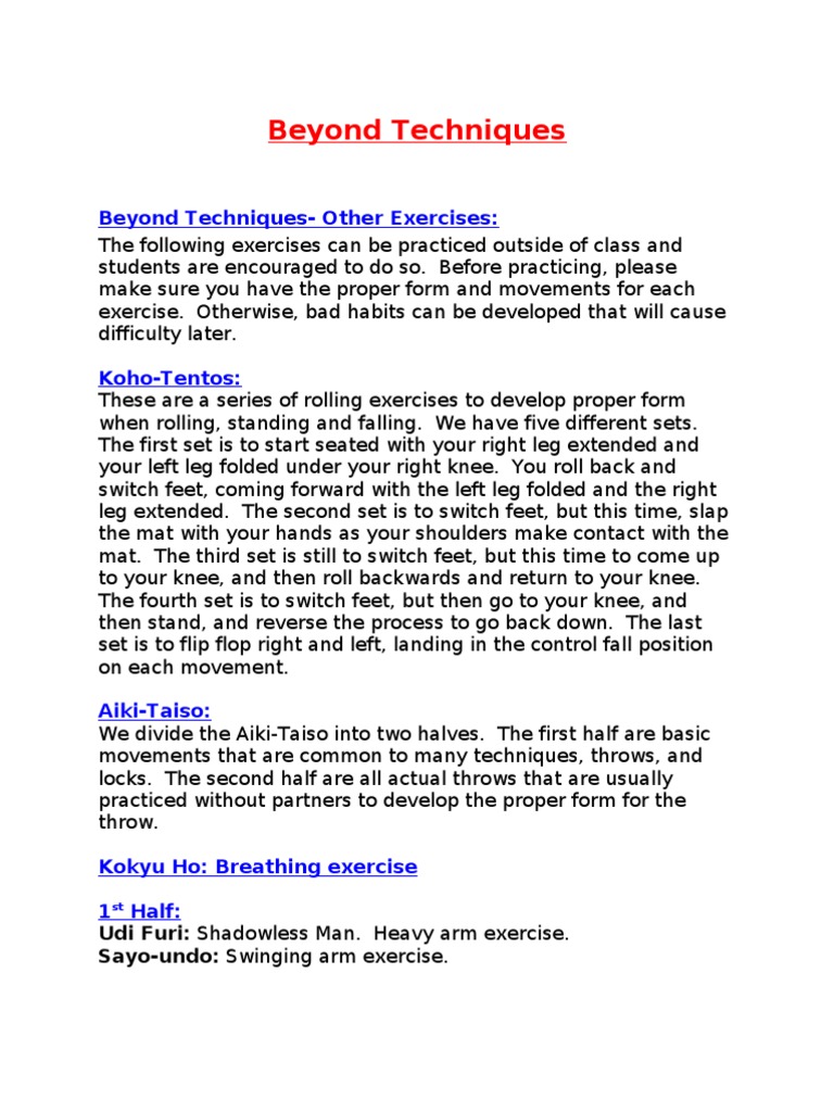 Sayo-undo Undo: Circular arm exercise. Fune Kogi: Rowing exercise. Shomen Uchi: Overhead attack exercise. Cheri Happo: Spinning exercise Cheri Happo Undo: Blending exercise. 2nd Half: Ushiro-tori Kokyunage: Defense against a bear hug from behind. Ushiro-tori Kokyunage Undo: Variation of defense against a bear hug from behind. Ushiro Tekube-tori Kubishime Kokyu-nage: Defense against a choke and immobilization from behind. Ushiro Tekube-tori Kubishime Koshi-nage: A different defense against a choke and immobilization from behind. Ushiro Tekube-tori Zenchin Kokyu-nage: Defense against a static two-handed wrist grab from behind. Ushiro Tekube-tori Zenchin Kokyu-nage Undo: Defense against a two-handed wrist grab from behind where you are being pushed forward. Ushiro Tekube-tori Kotai Kokyu-nage: Defense against a twohanded wrist grab from behind where you are being pulled backwards. Katatori Sume-otoshi: Defense against a front lapel grab. Ibbuki Breathing: Ibbuki breathing is a set of controlled breathing exercises. They have many benefits including relaxation, breath control, increasing lung capacity, and endurance training. The basic mechanics of the exercise is to breath in slowly through the nose, and then exhale even slower through the mouth, controlling the air flow by constricting the larynx. If done properly, the escaping air produces a rasping sound. Initially, a count of five will be used for the inhale and a count of ten for the exhale. There will also be other physical and mental movements combined with the breathing to assist in relaxation, balance, and ki extension.