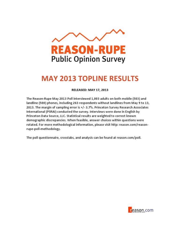 Topline poll results from the May 2013 Reason-Rupe poll. Topics include gun control, Social Security reform, federal government spending, plastic bag bans, universal pre-school, 3-D Printers, the TSA, and more. Read more at reason.com/poll.