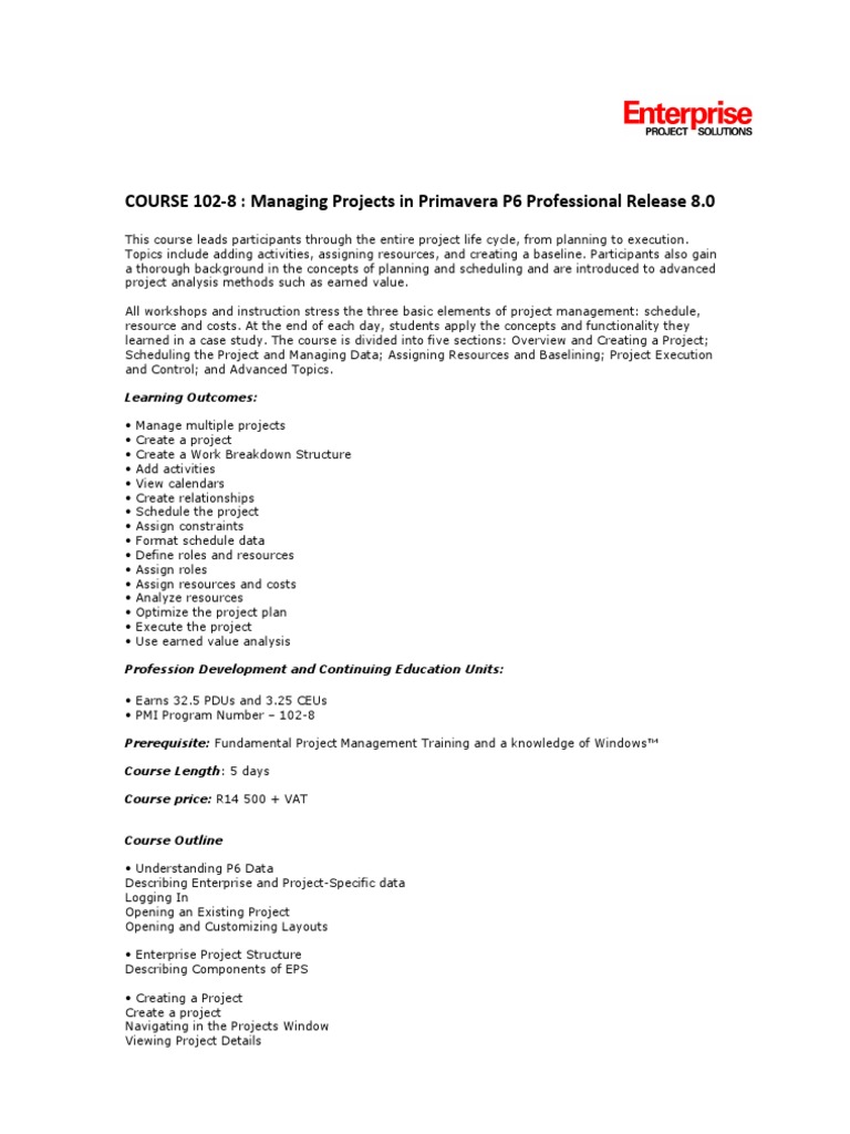 Course Outline Understanding P6 Data Describing Enterprise and Project-Specific data Logging In Opening an Existing Project Opening and Customizing Layouts Enterprise Project Structure Describing Components of EPS Creating a Project Create a project Navigating in the Projects Window Viewing Project Details