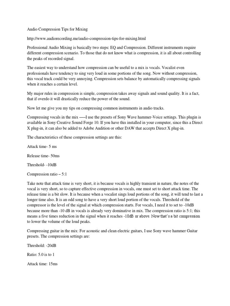 Audio Compression Tips for Mixing http://www.audiorecording.me/audio-compression-tips-for-mixing.html Professional Audio Mixing is basically two steps: EQ and Compression.