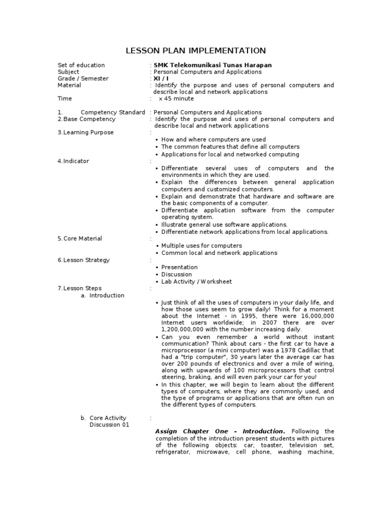 1. Competency Standard : Personal Computers and Applications 2.Base Competency : Identify the purpose and uses of personal computers and describe local and network applications 3.Learning Purpose : How and where computers are used The common features that define all computers Applications for local and networked computing 4.Indicator : Differentiate several uses of computers and the environments in which they are used. Explain the differences between general application computers and customized computers. Explain and demonstrate that hardware and software are the basic components of a computer. Differentiate application software from the computer operating system. Illustrate general use software applications. Differentiate network applications from local applications. 5.Core Material : Multiple uses for computers Common local and network applications 6.Lesson Strategy : Presentation Discussion Lab Activity / Worksheet 7.Lesson Steps : a. Introduction Just think of all the uses of computers in your daily life, and how those uses seem to grow daily! Think for a moment about the Internet - in 1995, there were 16,000,000 Internet users worldwide; in 2007 there are over 1,200,000,000 with the number increasing daily. Can you even remember a world without instant communication? Think about cars - the first car to have a microprocessor (a mini computer) was a 1978 Cadillac that had a "trip computer", 30 years later the average car has over 200 pounds of electronics and over a mile of wiring, along with upwards of 100 microprocessors that control steering, braking, and will even park your car for you! In this chapter, we will begin to learn about the different types of computers, where they are commonly used, and the type of programs or applications that are often run on the different types of computers. b. Core Activity Discussion 01 : Assign Chapter One - Introduction. Following the completion of the introduction present students with pictures of the following objects: car, toaster, television set, refrigerator, microwave, cell phone, washing machine,