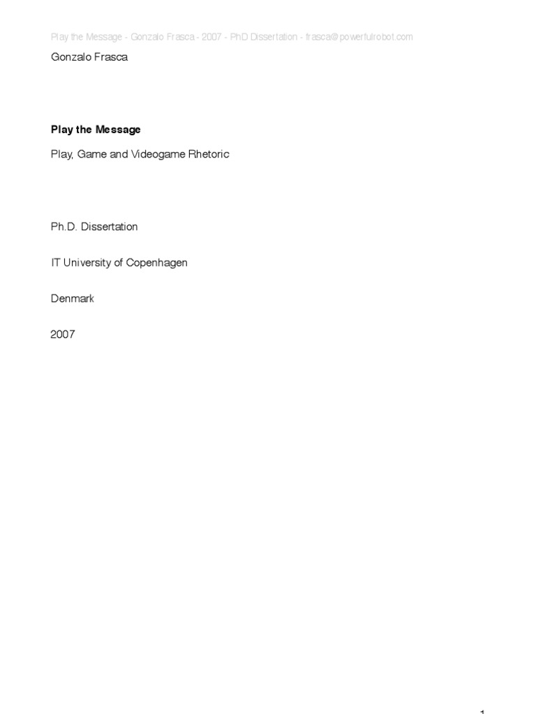 This dissertation is submitted in partial fulllment of the requirements for the degree of Doctor of Philosophy (Ph.D.) at the IT University of Copenhagen. Title: Play the Message: Play, Game and Videogame Rhetoric Candidate: Gonzalo Frasca frasca@powerfulrobot.com Supervisor: Espen Aarseth