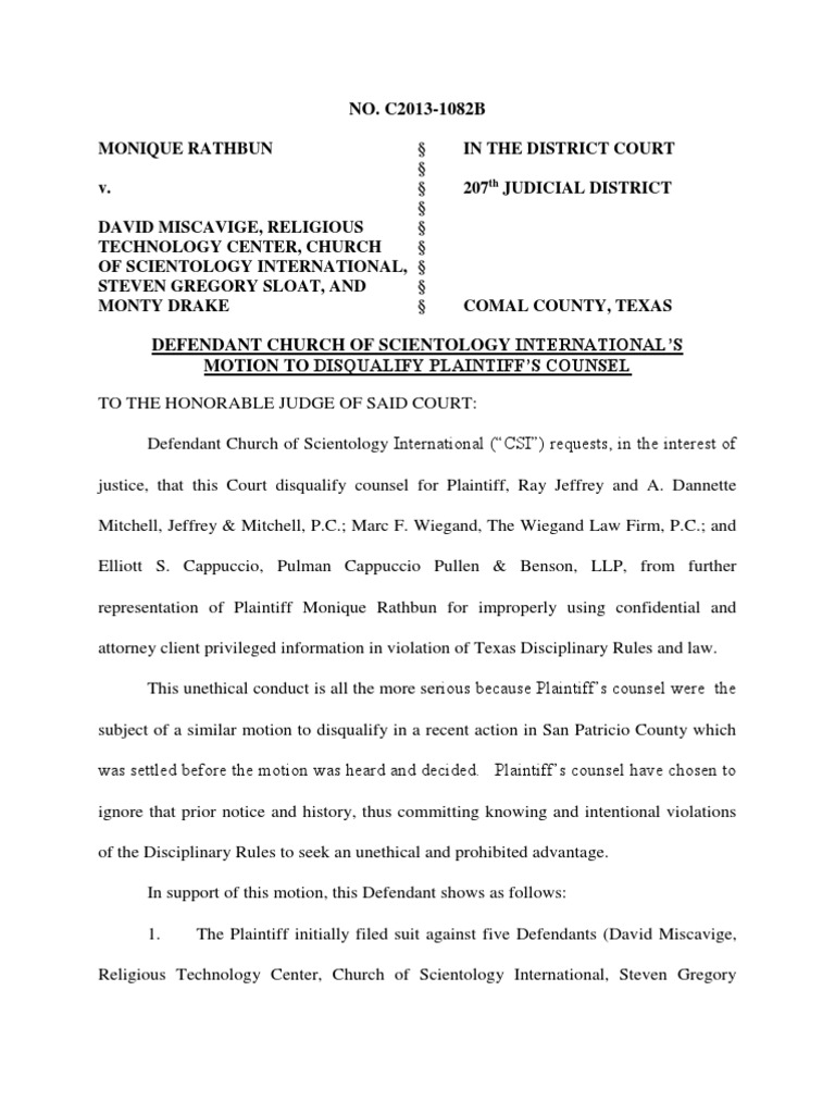 ignore that prior notice and history, thus committing knowing and intentional violations of the Disciplinary Rules to seek an unethical and prohibited advantage. In support of this motion, this Defendant shows as follows: 1. The Plaintiff initially filed suit against five Defendants (David Miscavige, Religious Technology Center, Church of Scientology International, Steven Gregory