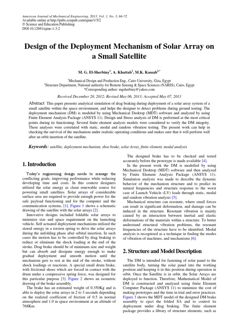 Mechanical Design and Production Eng., Cairo University, Giza, Egypt Structure Department, National authority for Remote Sensing & Space Sciences (NARSS), Cairo, Egypt *Corresponding author: mgsherbiny@[Link]