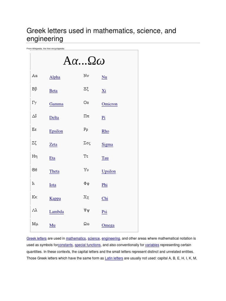 Greek letters are used in mathematics, science, engineering, and other areas where mathematical notation is used as symbols forconstants, special functions, and also conventionally for variables representing certain quantities. In these contexts, the capital letters and the small letters represent distinct and unrelated entities. Those Greek letters which have the same form as Latin letters are usually not used: capital A, B, E, H, I, K, M,