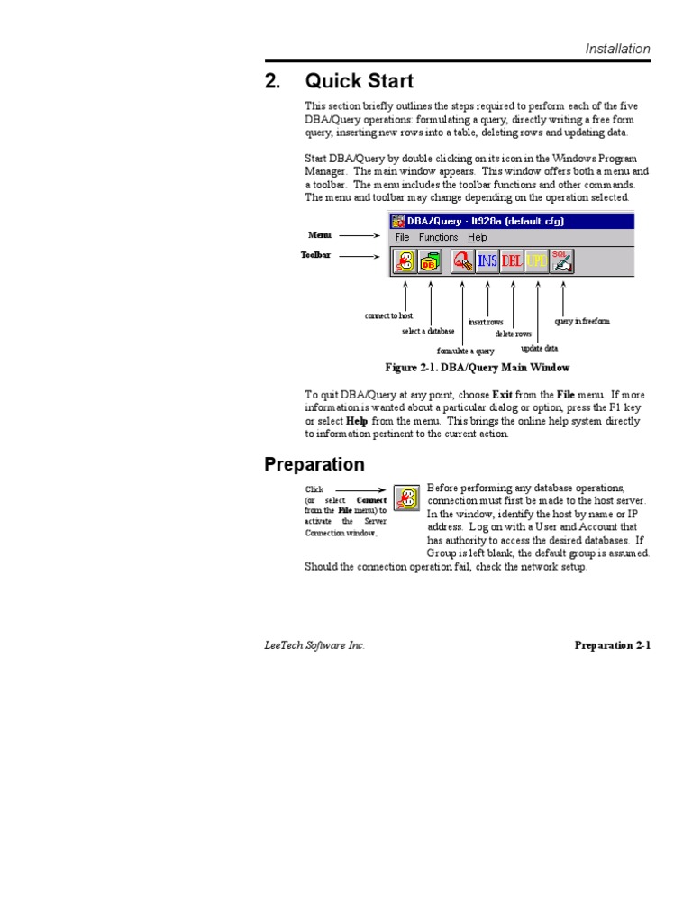 This section briefly outlines the steps required to perform each of the five DBA/Query operations: formulating a query, directly writing a free form query, inserting new rows into a table, deleting rows and updating data. Start DBA/Query by double clicking on its icon in the Windows Program Manager. The main window appears. This window offers both a menu and a toolbar. The menu includes the toolbar functions and other commands. The menu and toolbar may change depending on the operation selected.