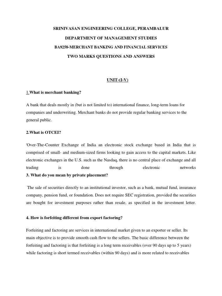 UNIT-(I-V) 1.What is merchant banking? A bank that deals mostly in (but is not limited to) international finance, long-term loans for companies and underwriting. Merchant banks do not provide regular banking services to the general public. 2.What is OTCEI? 'Over-The-Counter Exchange of India an electronic stock exchange based in India that is comprised of small- and medium-sized firms looking to gain access to the capital markets. Like electronic exchanges in the U.S. such as the Nasdaq, there is no central place of exchange and all trading is done through electronic networks