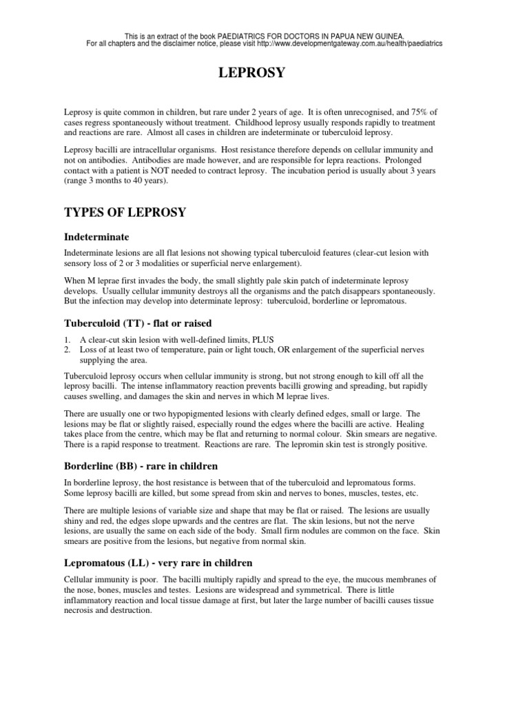 Bagshawe A. Trans Roy Soc Trop Med Hyg 83:121-7,1989. Epidemology of leprosy. Browne SG. Leprosy in children. Geneva: WHO, 1976. Editorial. Lancet 2:487-488,1988. Chemotherapy of leprosy. Jopling WH. Handbook of leprosy. 3rd ed. London: Heinemann, 1984.
