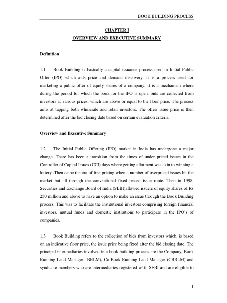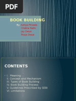 The basic process of Book-Building is as follows: The issuer who is planning a IPO nominates a lead merchant as a book runner. The issuer specifies the number of securities to be issued and the price band for orders. The issuer also appoints syndicate members with whom orders can be placed by the investors. Investors place their order with a syndicate member who inputs the orders into the Electronic book. This process is called bidding and is similar to open auction. A book should remain open for a minimum of five days. Bids cannot be entered less than the floor price. Bids can be revised by the bidder before the issue closes. On the close of the book building period the book runner evaluates the bids on the basis of the evaluation criteria which may include : Price Aggression Investor quality Earliness of bids etc.