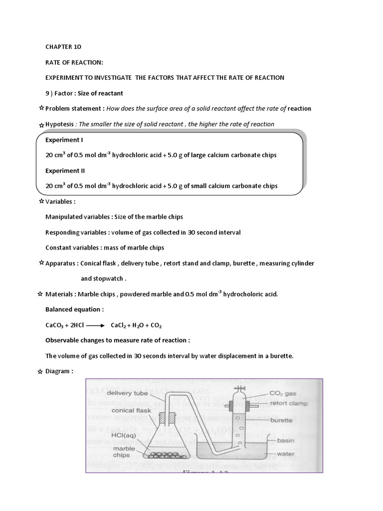 CHAPTER 10 RATE OF REACTION: EXPERIMENT TO INVESTIGATE THE FACTORS THAT AFFECT THE RATE OF REACTION 9 ) Factor : Size of reactant