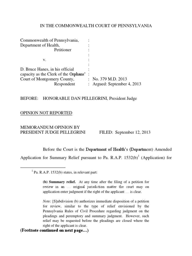IN THE COMMONWEALTH COURT OF PENNSYLVANIA Commonwealth of Pennsylvania, : Department of Health, : Petitioner : : v. : : D. Bruce Hanes, in his official : capacity as the Clerk of the