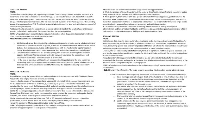 HELD: SC found the actions of respondent judge cannot be supported with 1. While the probate of the will was denied, the order to this effect is not yet final and executory. Matias being universal heiress and executrix still has special interest to protect. 2. While generally, there should only be 1 special administrator maybe appointed, probate court in its discretion, when it deems best, and whenever there are at least two factions among heirs, may appoint more than 1 special administrator or a special co-adminstrator but to administer the whole single estate exercising jointly powers of administration temporaily and not independently. 3. On technical side, there was late notice of hearing for the removal of Rodriguez as special administrator, and lack of notice that Basilia and Victorina be appointed as special administrator while in their motion, it only seek removal of Rodriguez and appointment of Plata. ROXAS VS. PECSON FACTS: -Pablo Roxas died, thus his sister and brother, maria and pedro the respondents herein filed petition for intestate proceeding and be appointed as [Link] later on dismissed, as petitioner Natividad roxas, the surving spouse filed petition for probate of the last will where she was named as executrix and half of the property bequethed to her and the other half to pablo s adulterous child. Later on, the will was denied probate technically for lack of signatures. Petitioner spouse appealed and pray she be appointed as special administrator. So Maria and Pedro petitioned the court to be appointed as special administrators. The judge ordered the appointment of Natividad as special administartor but only for the conjugal property of the deceased and appoint at the same time Maria to administer the exclusive property of the deceased. Hence this petition by the surviving spouse ISSUE: w/n judge committed grave abuse of discretion in appointing 2 separate special adminstrator of the decedent. HELD: SC held in the affirmative. The judge erred in appointing 2 independent special administrators 1. It finds no reason to do so especially if the estate to be settled is that of the deceased husband a. Since marriage is dissolved upon death of the husband or wife, it follows then that that the community property shall be inventoried, administered and liquidated, and the person to do this shall also be the one to administer, Distribute and liquidate the exclusive property of the deceased spouse b. The widow, who still has a beneficial interest even after the will was diapproved since pending appeal, has the right of usufruct over the of the exclusive property of decedent besides her share in the conjugal partnership. And has more interest in the entire estate correctly c. The beneficial interest required as qualification for appointment of administrator is the interest in the whole estate and not only in some part thereof d. Lastly, Since under the law, only one general administrator may be appointed to administer, liquidate and distribute estate of the deceased, it follows then that only 1 special administrator maybe appointed in lieu of the former until question causing delay are decided.