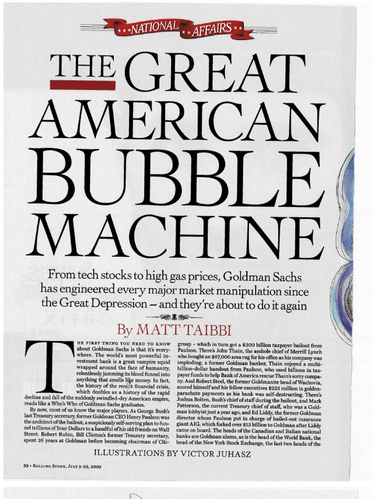 This is the now Infamous article by Matt Taibbi on Goldman Sachs and their roll in history's financial crashes. Check out his earlier piece on Wall St "The Big Take Over" also worth while ar…