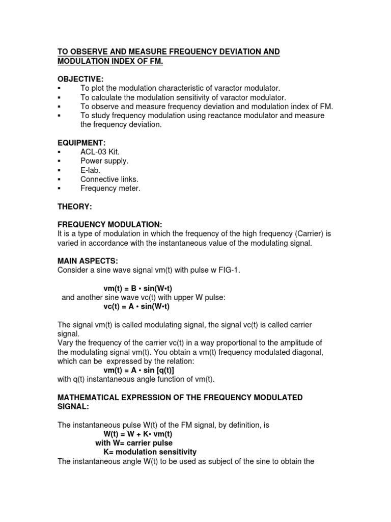 OBJECTIVE: To plot the modulation characteristic of varactor modulator. To calculate the modulation sensitivity of varactor modulator. To observe and measure frequency deviation and modulation index of FM. To study frequency modulation using reactance modulator and measure the frequency deviation. EQUIPMENT: ACL-03 Kit. Power supply. E-lab. Connective links. Frequency meter. THEORY: FREQUENCY MODULATION: It is a type of modulation in which the frequency of the high frequency (Carrier) is varied in accordance with the instantaneous value of the modulating signal. MAIN ASPECTS: Consider a sine wave signal vm(t) with pulse w FIG-1. vm(t) = B sin(Wt) and another sine wave vc(t) with upper W pulse: vc(t) = A sin(Wt) The signal vm(t) is called modulating signal, the signal vc(t) is called carrier signal. Vary the frequency of the carrier vc(t) in a way proportional to the amplitude of the modulating signal vm(t). You obtain a vm(t) frequency modulated diagonal, which can be expressed by the relation: vm(t) = A sin [q(t)] with q(t) instantaneous angle function of vm(t). MATHEMATICAL EXPRESSION OF THE FREQUENCY MODULATED SIGNAL: The instantaneous pulse W(t) of the FM signal, by definition, is W(t) = W + K vm(t) with W= carrier pulse K= modulation sensitivity The instantaneous angle W(t) to be used as subject of the sine to obtain the