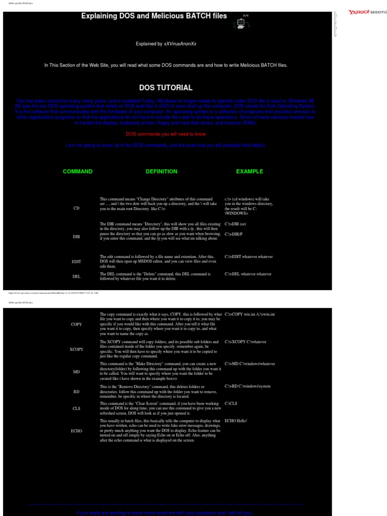 In This Section of the Web Site, you will read what some DOS commands are and how to write Melicious BATCH files.