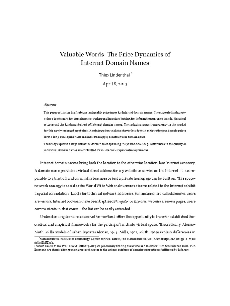 land rents by dierences in the distance to jobs or amenities. Applying this reasoning to domains, the price of a domain is hypothesized to depend on its proximity to potential users. Since a voyage on the world wide web usually begins with the user entering the domain name of the desired website into her web browser, distance to the user can be seen as the eort a user is required to make to correctly remember and type a domain name. An appealing domain name like [Link] is easy to recall and quickly entered. In this sense, an intuitive domain name is like a convenient down-town address linked to excellent transportation systems. Long or cryptic domain names are more burdensome, which is comparable to a longer commute to a location somewhere in the outskirts. Ieong et al. (2012) provide a similar, albeit non-spatial explanation for the value of domains. They show that domains help users to evaluate the reliability of search results from online search engines. Domains serve as brands for the displayed information. Based on this line of thought, dierences in domain prices could also stem from the brand-potential inherent in the domain name. Again, the catchy and easy to remember names will sell at a premium above registration costs.1 Dierences in location and brandability fuel a heated race for the shortest and most memorizable domain names that sprung up since the very rst domain was created in March 1985. By now, more than 240 million unique domain names are registered (Verisign, 2012) with no end of growth in total numbers in sight. An active secondary market facilitates investments in domains. Exclusive domains oftentimes trade for 5 or 6 gure dollar amounts, and some for even more. The current record in reported sales prices is the widely covered 13 million US dollar transaction of [Link] in 20102 . Trading of and investing into domains has quickly evolved from a geeky pastime of a few to the serious bread and butter industry feeding hundreds of professionals today. The focus of this paper is to estimate the rst constant quality price index for Internet domain names. It adapts an empirical framework borrowed from real estate research which is suitable for valuing infrequently traded and non-standardized assets like houses, antiques, pieces of art or, by analogy, virtual locations. The linguistic nature of Domains causes substantial heterogeneity in their quality, which makes domain names very comparable to traditional asset classes where the intrinsic