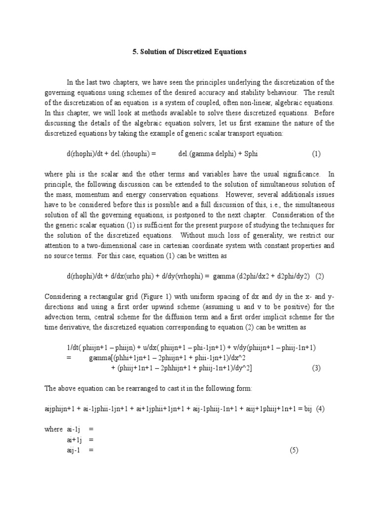 where phi is the scalar and the other terms and variables have the usual significance. In principle, the following discussion can be extended to the solution of simultaneous solution of the mass, momentum and energy conservation equations. However, several additionals issues have to be considered before this is possible and a full discussion of this, i.e., the simultaneous solution of all the governing equations, is postponed to the next chapter. Consideration of the the generic scalar equation (1) is sufficient for the present purpose of studying the techniques for the solution of the discretized equations. Without much loss of generality, we restrict our attention to a two-dimensional case in cartesian coordinate system with constant properties and no source terms. For this case, equation (1) can be written as d(rhophi)/dt + d/dx(urho phi) + d/dy(vrhophi) = gamma (d2phi/dx2 + d2phi/dy2) (2) Considering a rectangular grid (Figure 1) with uniform spacing of dx and dy in the x- and ydirections and using a first order upwind scheme (assuming u and v to be positive) for the advection term, central scheme for the diffusion term and a first order implicit scheme for the time derivative, the discretized equation corresponding to equation (2) can be written as 1/dt( phiijn+1 phiijn) + u/dx( phiijn+1 phi-1jn+1) + v/dy(phiijn+1 phiij-1n+1) = gamma[(phhi+1jn+1 2phiijn+1 + phii-1jn+1)/dx^2 + (phiij+1n+1 2phhijn+1 + phiij-1n+1)/dy^2] (3) The above equation can be rearranged to cast it in the following form: aijphijn+1 + ai-1jphii-1jn+1 + ai+1jphii+1jn+1 + aij-1phiij-1n+1 + aiij+1phiij+1n+1 = bij (4) where ai-1j = ai+1j = aij-1 =